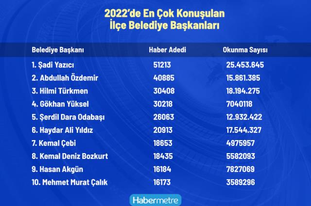 İnsansız haber analiz ve raporlama sistemi Habermetre, 2022 yılında en çok konuşulan İstanbul ilçe belediye başkanlarını analiz etti. Listenin zirvesinde Tuzla Belediye Başkanı Şadi Yazıcı, ikinci sırasında Bağcılar Belediye Başkanı Abdullah Özdemir, üçüncü sırasında ise Üsküdar Belediye Başkanı Hilmi Türkmen yer aldı.
