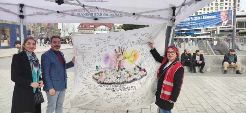 Bağcılar meydanda gerçekşelen Cumhuriyet Halk Partisi (CHP) Bağcılar İlçe Başkanlığı İlçe Ar-ge ve Projeler Komisyonu tarafından ‘Uyuşturucu Maddeye Hayır Sağlıklı Gençlerle Sağlıklı Nesiller İçin Bir İmza da sen at’ imza günü İmza kampanyası halktan yoğun ilgi gördü.