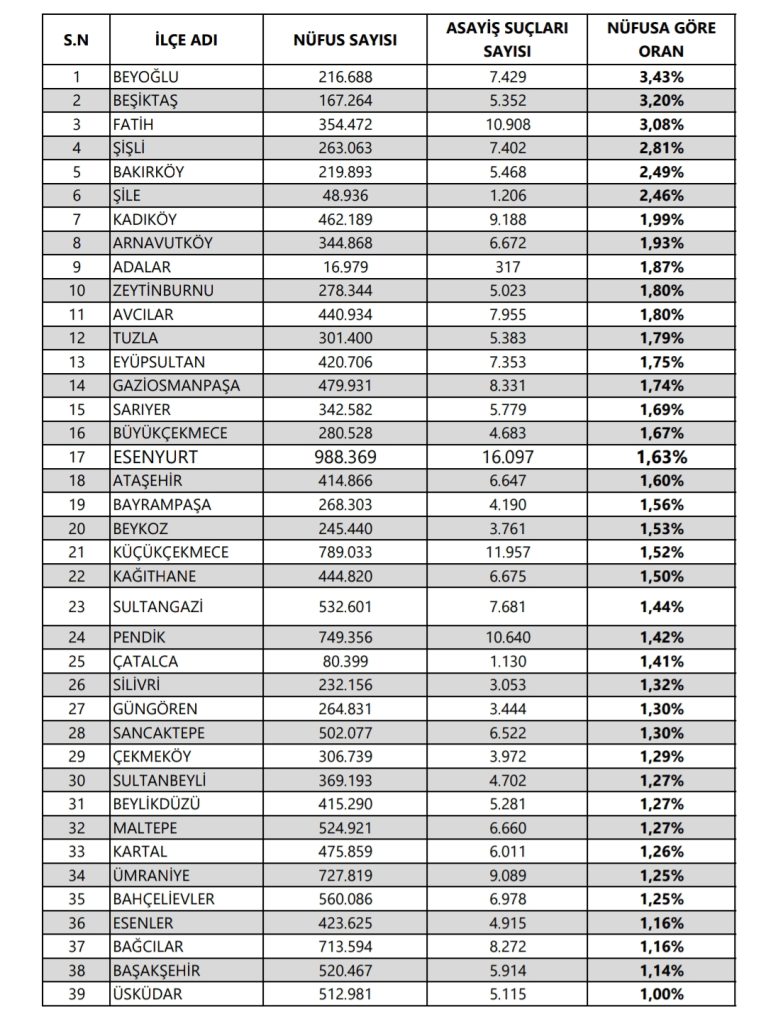 Nüfus oranını da düşünürsek Bağcılar sıralamada çok çok geride olduğunu görüyoruz. Genel sıralama da dokuz aylık rapora göre 16. sırada yer alıyor. Nüfusa oranladığımızda bu sıralama otuzlu rakamların altına kadar düştüğünü görüyoruz.
