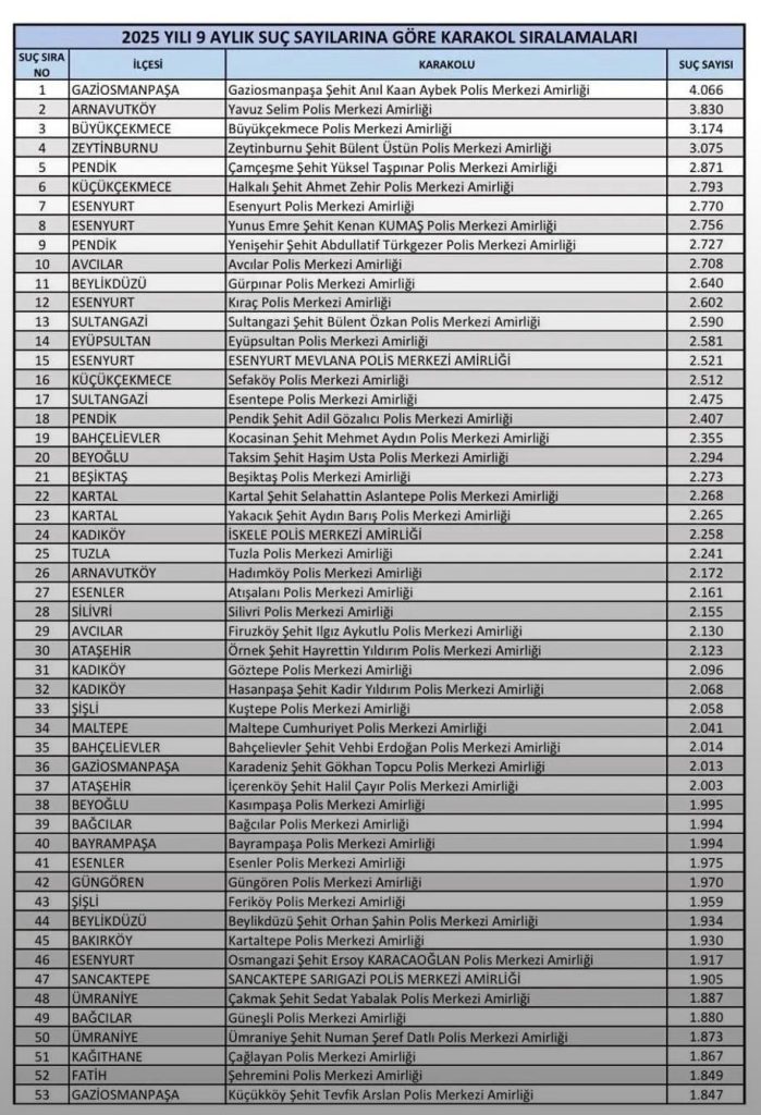 2025 yılı 9 aylık suç sayılarına göre karakol sıralamalarına baktığımızda 53 karakol içerisinde Bağcılar Polis Merkezi Amirliği 1994 suç sayısı ile 39.sırada yer alırken, Güneşli Polis Merkezi Amirliği 1880 suç sayısı ile 49.sırada yer alıyor. Dokuz aylık veriye göre Bağcılar’da toplam suç sayısı 3874 iken Esenyurt ilçesinde 12566, Pendik ilçesinde 8005, Gaziosmanpaşa ilçesinde 7926, Kadıköy ilçesinde 6422, Arnavutköy ilçesinde 6002, Küçükçekmece ilçesinde 5305, Sultangazi ilçesinde 5065, Avcılar ilçesinde 4838, Beylikdüzü ilçesinde 4574, Kartal ilçesinde 4533, Bahçelievler ilçesinde 4369, Beyoğlu ilçesinde 4289, Esenler ilçesinde 4136, Ataşehir ilçeinde 4126, Şişli ilçesinde 4017, Ümraniye ilçesinde 3760, Büyükçekmece ilçesinde 3174, Zeytinburnu ilçesinde 3075, Eyüpsultan ilçesinde 2581, Beşiktaş ilçesinde 2273, Tuzla ilçesinde 2241, Maltepe ilçesinde 2041, Bayrampaşa ilçesinde 1994, Güngören ilçesinde 1970, Bakırköy ilçesinde 1930, Sancaktepe ilçesinde 1905, Kağıthane ilçesinde 1867 ve Fatih ilçesinde 1849 suç işlenmiştir.