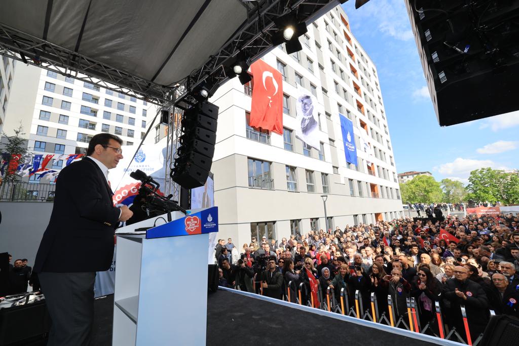Ekrem İmamoğlu “Ne yapacağımızı, nasıl yapacağımızı çok iyi biliyoruz. Uzlaşma, tahliye yapım dahil tüm süreçleri ‘İstanbul Yenileniyor’ modeliyle yürütülen ve bugün hak sahiplerine anahtarlarını teslim edeceğimiz Bağcılar Kiraz Evler Projesi bu işi çok iyi bildiğimizin ve doğru yaptığımızın net olarak göstergesidir. Bakın burada binaların hepsinin yıkımını yaptık. 253 konut. Burası, 1992 yılında inşa edilmiş As Fatih Kent Sitesi. Eski site 2017 yılında riskli yapı ilan ediliyor. Sitede yaşayanlar, çok uzun süre dönüşüm için çare aradılar. Dayanıksız bloklarda korku içinde yaşadılar. Sonuçta 2020’de ki yine bizim teşvikimizle üçte iki çoğunluğu sağladılar. Geldiler, Kiptaş’a başvurdular. Kiptaş örnek proje için çalışmalara başladı ve mimari projesini de site sakinleriyle paylaşıp onların beğenilerine de sunuldu. Nisan 2021’de yani tam 2 yıl önce buranın yıkımını başlattığımızda arkadaşlarım 3 günde yıkılmasını planlamıştı ama tam 8 saatte yıkıldı. O kadar kötü koşullarda olan bir binaydı. Bugün de burayı teslim ediyoruz. Bir örnek verelim. İstanbul’da bugün kampanya yapan aklın örneğini; TOKİ Tuzla’da 3 buçuk yılda 508 adet konutun yalnızca temelini atabildi şu ana kadar. Onun için ben arkadaşlarıma hep söyledim. Havaya bakıp iş yapmayacaksınız. Vatandaşla konuştuğunuz her işi zamanında teslim edeceksiniz. Onun için ben buradan Kiptaş’ın emek veren bütün çalışanlarına, buradaki yüklenici kardeşlerime, onların çalışanlarına, genel müdürüne, yönetimine yürekten teşekkür ediyorum” dedi. Ekrem İmamoğlu’nun konuşması sonrası, 253 konut ve 1 kreşten oluşan projenin, anahtar teslimlerinin bir kısmı sahnede gerçekleştirildi. Tören sonunda, İmamoğlu alandan ayrıldı.