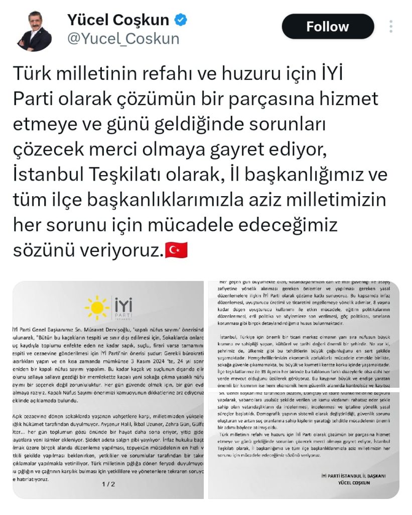 İYİ Parti Genel Başkanı Müsavat Dervişoğlu kapalı nüfus sayımı önerisinde bulunmuştu. İYİ Parti İstanbul İl Başkanı Yücel Coşkun da bunun önemine vurgu yaparak milletin refahı için her şeyi yapacaklarına dair söz verdi.