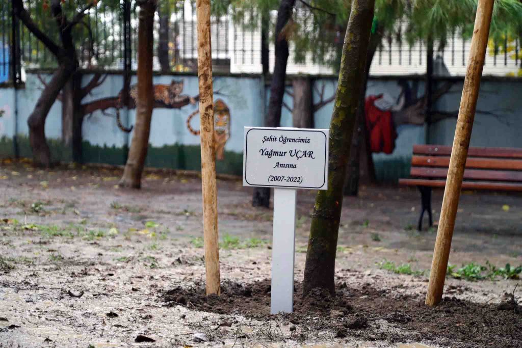 Yağmur yağışının altında toplanan davetliler, Yağmur adına okul bahçesine fidan dikti. Fidanın yanına da “Şehit Öğrencimiz Yağmur Uçar Anısına (2007 – 2022) yazısı konuldu. Fidanın dikilmesinin ardından davetliler, hep birlikte başta Yağmur olmak üzere terör saldırısında yaşamını yitirenler için dua etti. Yağmur’un yakınlarına, öğretmen ve sınıf arkadaşlarına başsağlığı dileyen Yerlikaya, “Yüreğimiz bir daha böyle dağlanmasın, aynı acıları yaşamayalım” dedi. Özdemir ise “Yağmur aramızdan ayrıları bugün tam bir ay oldu. Onu hiç unutmadık. Onun adına diktiğimiz fidanın da geleceğe nefes olmasını temenni ediyorum” diye konuştu.